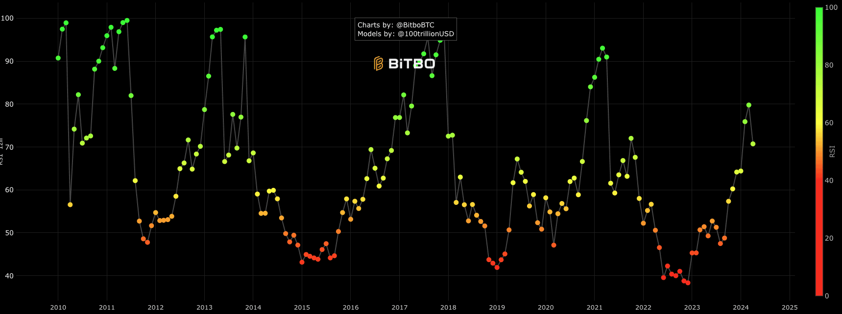 Doch so langsam scheint der Kryptomarkt abzukühlen, das Marktsentiment schlägt um. Mit 71 von 100 möglichen Punkten zeigt der RSI langsam in Richtung Korrektur. Das schafft Platz für mögliche Aufwärtstrends.
