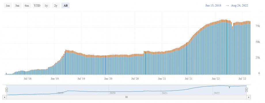 Spannende Einblicke bietet die Netzwerkkapazität, also die im Protokoll enthaltenen Bitcoin. Wie bei den vorherigen Graphen lässt sich ein Einbruch Anfang Juli erkennen, nachdem der Bitcoin-Kurs auf unter 20.000 US-Dollar gefallen war. Interessant: Die Menge an “eingezahlten” Bitcoin ist in diesem Zusammenhang sogar weiter gestiegen.
