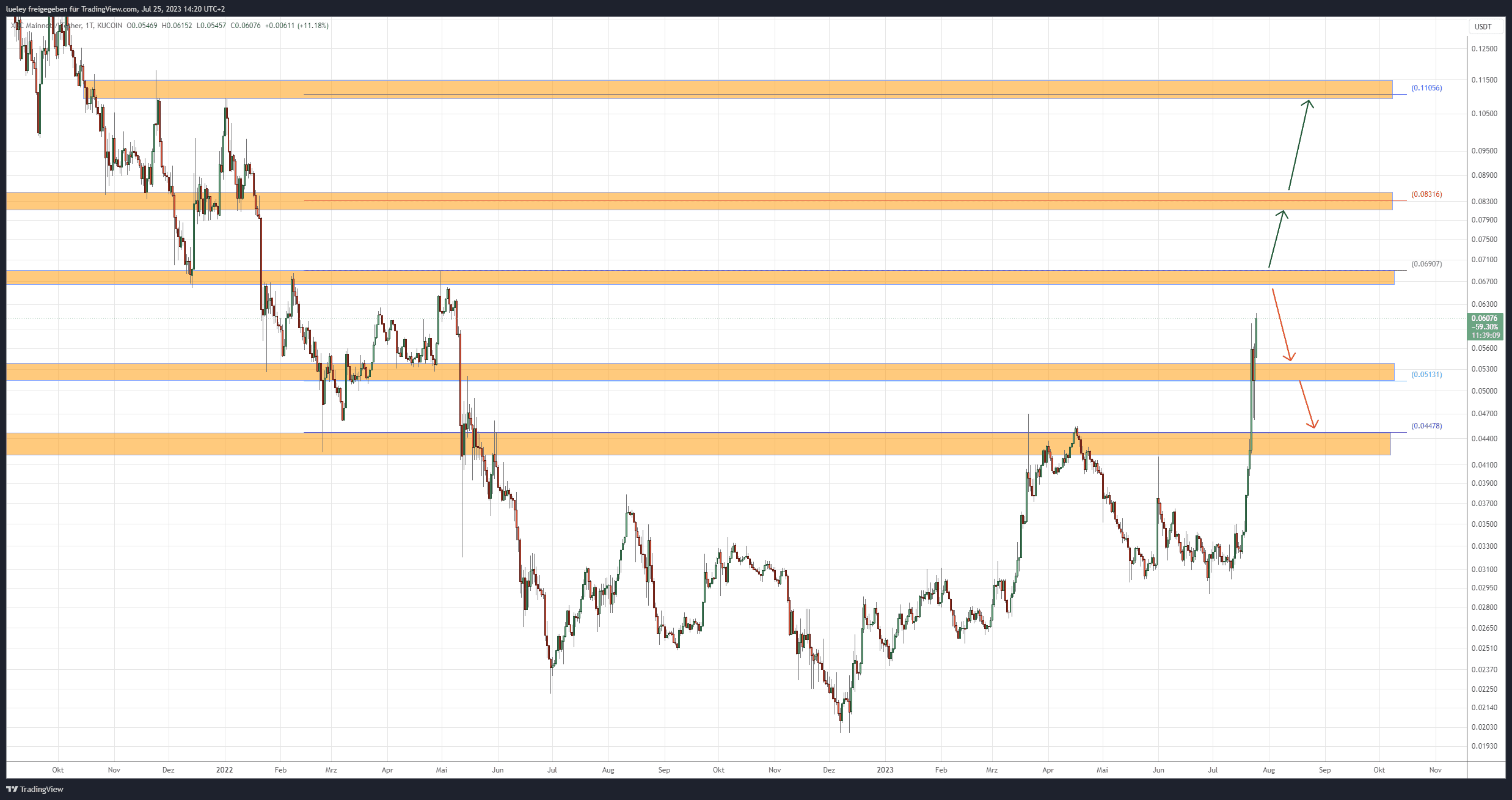 - Dreht der Kurs im Zuge einer anhaltenden Schwäche im Kryptomarkt in den kommenden Tagen zurück in Richtung Süden um, ist ein Retest der Supportzone um 0,051 US-Dollar einzuplanen.