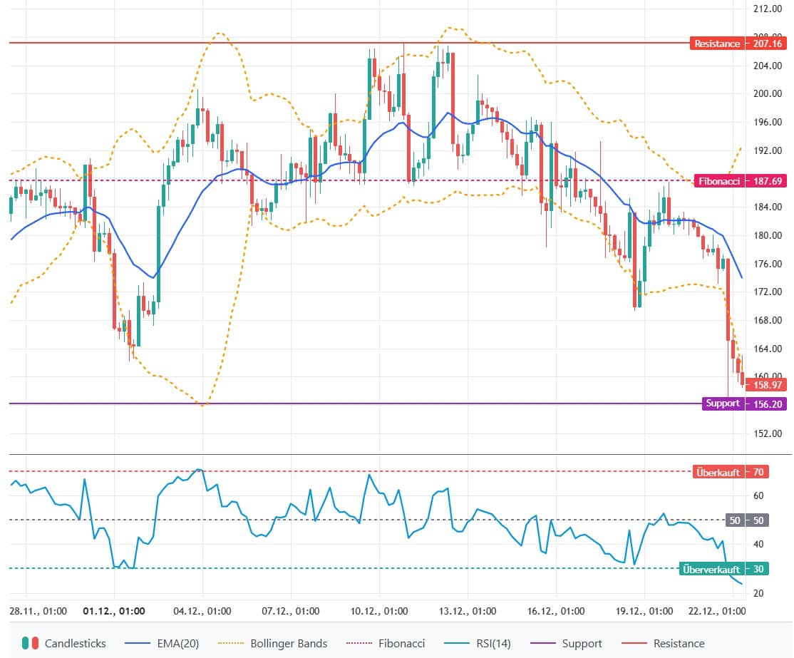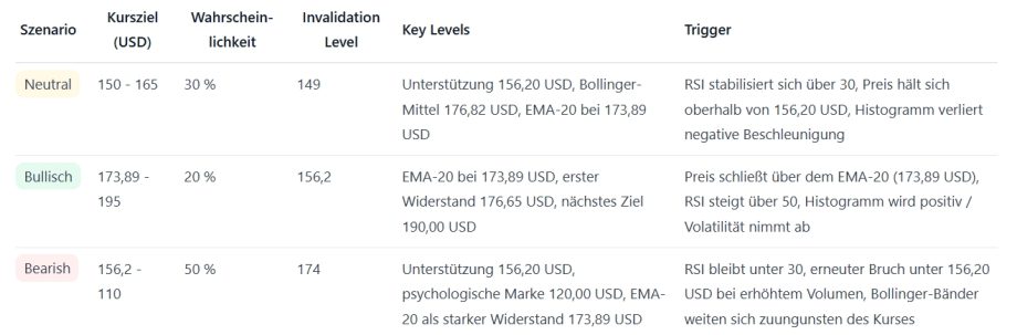 Die kurzfristige Prognose fällt neutral bis klar bärisch aus. Die Ausverkaufsdynamik dominiert aktuell, eine Stabilisierung ist möglich, der technische Bias bleibt aber negativ. Unterstützungen: 156,20 USD (aktuelles Tief) und 150,00 USD; Widerstände: 160,99 USD (Bollinger-Unterband) und 173,89 USD (EMA‑20). Ein nachhaltiger Ausbruch über 173,89 USD würde kurzfristig Erholung einleiten, während ein Bruch unter 156,20 USD weitere Abgaben wahrscheinlicher macht.