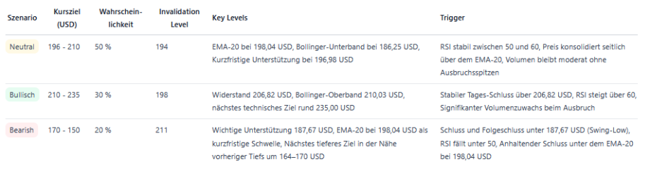 Der Kurs notiert klar über dem EMA-20 (198,04 USD) und bildet in den letzten Sessions überwiegend höhere Hochs und höhere Tiefs, was kurzfristige Stärke signalisiert. Unterstützungen liegen bei 187,67 USD (letzter signifikanter Swing) und 196,98 USD; unmittelbare Widerstände bei 206,82 USD (aktuelles High) und dem Bollinger-Oberband ~210,03 USD. Solange der Kurs über dem EMA-20 bleibt, ist die Marktlage kurzfristig bullish.