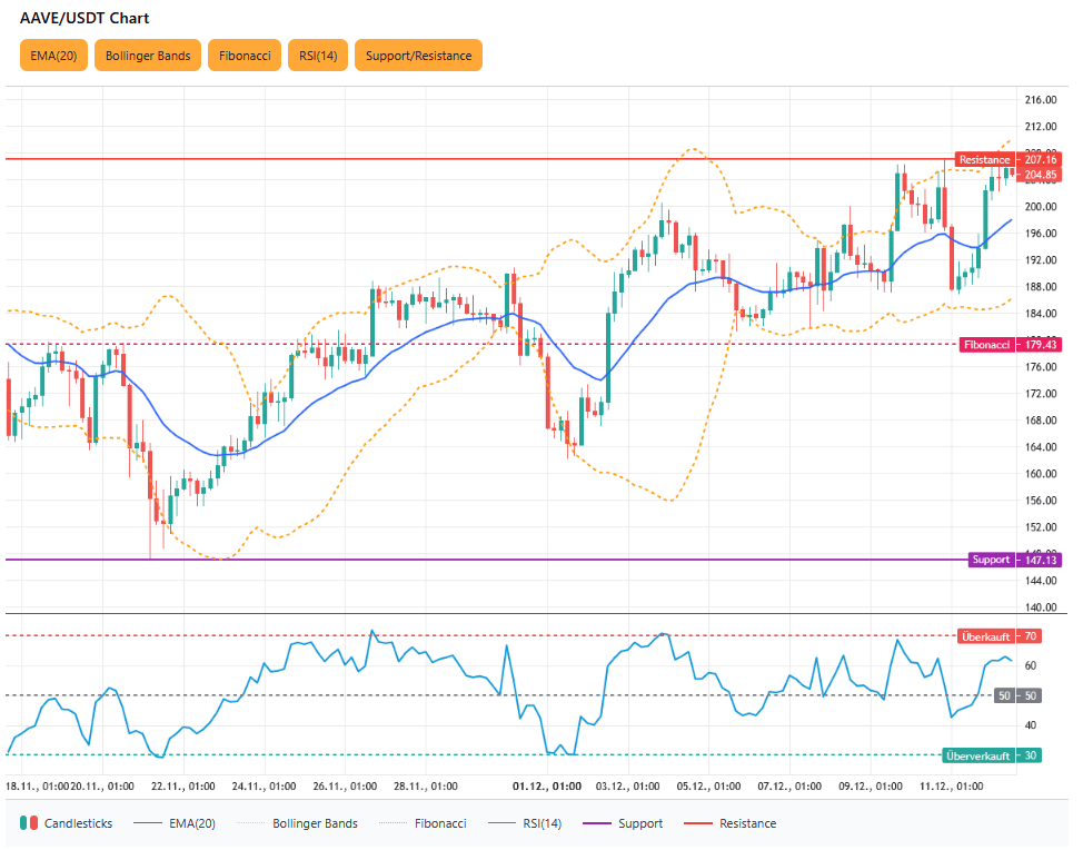 Kurzfristig bleibt die Prognose für AAVE am 12.12.2025 leicht bullish, da der Kurs über dem EMA-20 notiert und die Fibonacci-Position einen Aufwärtstrend ausweist. Relevante Unterstützungen liegen bei 187,67 USD und 196,98 USD; Widerstände bei 206,82 USD und circa 210,03 USD. Ein stabiler Schluss über 206,82 USD mit steigendem Volumen würde ein bullishes Ausbruchsszenario eröffnen, während ein nachhaltiger Bruch unter 187,67 USD das Risiko signifikanterer Rücksetzer erhöht. Für Anleger gilt: Positionsgrößen an Volatilität anpassen und Invalidation-Levels beachten.