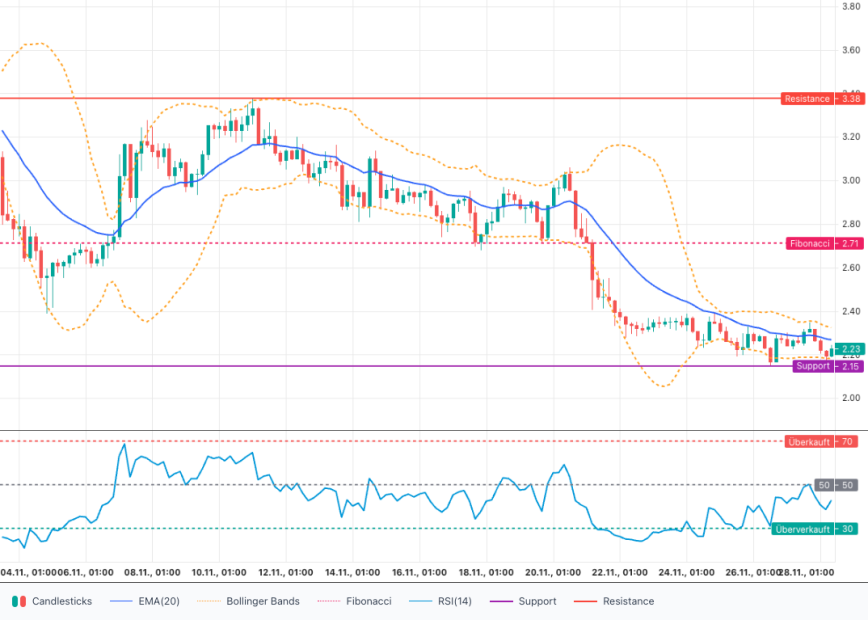 Der Kurs notiert leicht unter dem EMA-20 (2,268 USD) und zeigt eine jüngste Abfolge von tieferen Hochs und tieferen Tiefs. Nahe Unterstüzung ist bei 2,175 USD zu sehen, stärkere Unterstützung am früheren Swing-Low 2,149 USD; unmittelbare Widerstände liegen am EMA-20 (2,268 USD) und dem lokalen Hoch bei 2,350 USD. Solange der Kurs unter dem EMA-20 bleibt, ist die kurzfristige Lage bärisch geprägt.