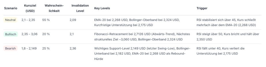 Gesamtbewertung: Kurzfristig neutral bis leicht bärisch aufgrund des Handels unter dem EMA-20 und einer Sequenz tieferer Hochs. Unterstützungen: 2,175 USD (kurzfristig) und 2,149 USD (wichtiger Swing-Low). Widerstände: 2,268 USD (EMA-20) und 2,350 USD (lokales Hoch). Ein nachhaltiger Ausbruch über 2,350 USD mit Bestätigung über dem EMA-20 würde das kurzfristige Sentiment aufhellen; ein Bruch unter 2,149 USD dürfte zu beschleunigter Abwärtsbewegung führen.