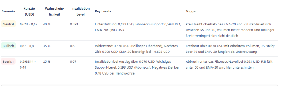 Sollte der Kurs hingegen deutlich unter 0,59 US-Dollar fallen, wäre Vorsicht angebracht. In diesem Fall könnte sich der Rückgang beschleunigen und den Kurs in Richtung 0,48 bis 0,50 US-Dollar drücken.