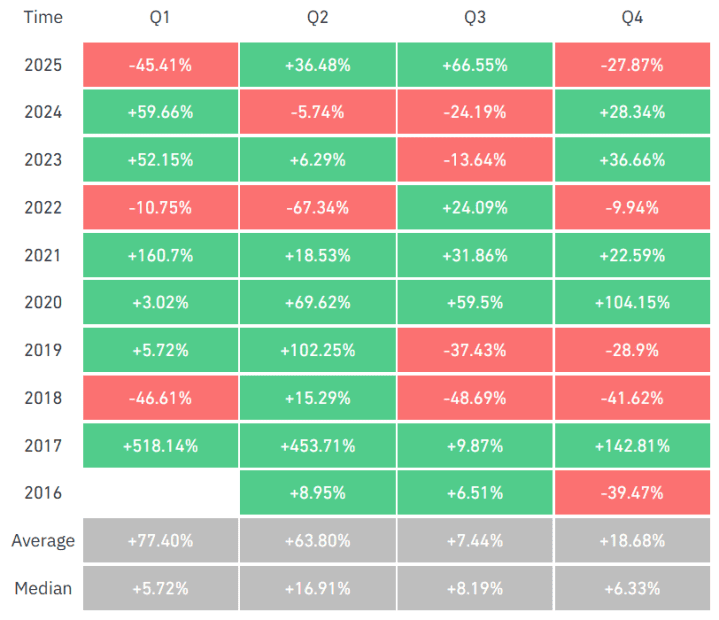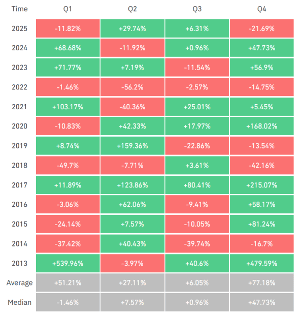 Historisch betrachtet zählt das erste Quartal zu den solideren Phasen für Bitcoin. Über mehrere Marktzyklen hinweg konnte die größte Kryptowährung im Durchschnitt ein Plus von rund 51,21 Prozent im Zeitraum von Januar bis März verzeichnen. Damit gehört Q1 statistisch zu den stärkeren Quartalen, auch wenn die Schwankungsbreite zwischen einzelnen Jahren erheblich ist.