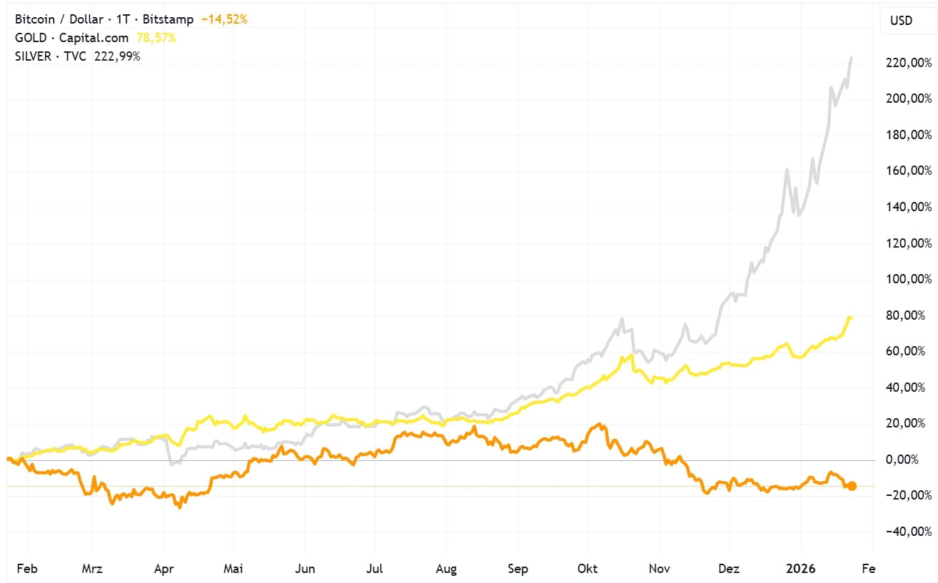 Statt der erhofften Bitcoin-Trendwende bringt der Januar eine Fortsetzung des vergangenen Handelsjahres: Während Gold und Silber beständig neue Allzeithochs ins Visier nehmen, dümpelt die Krypto-Leitwährung müde vor sich hin. Die Zahlen sprechen eine denkbar klare Sprache: Der Goldpreis legte auf Jahressicht um 78 Prozent zu, der Silberpreis explodierte sogar regelrecht um 222 Prozent – Bitcoin hingegen musste einen Verlust von 14 Prozent verkraften. Kein Wunder, dass Edelmetallanhänger wie Peter Schiff angesichts dieser Situation eine große Genugtuung verspüren.