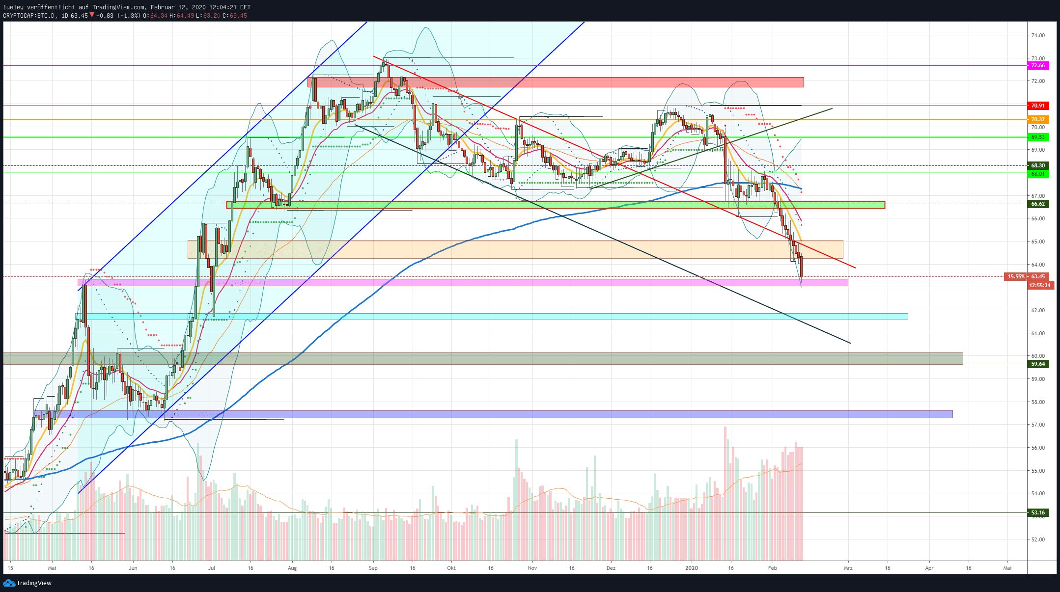 Sah es in der Vorwoche noch nach einer möglichen Stabilisierung der Bitcoin-Dominanz aus, kam diese Woche der nächste Einbruch. Der Kurs rutschte unter den orangen Supportbereich bei 64,33 Prozent und notiert aktuell bei 63,80 Prozent. Damit ist das prognostizierte Ziel aus der Vorwoche, die lila Supportzone bei 63 Prozentpunkten, nun bereits fast erreicht. Der Abgabedruck scheint aktuell beträchtlich. Sollte diese Unterstützung keinen Halt geben, ist mit einem Anlaufen des Kreuzsupports aus grüner Abwärtstrendlinie und hellblauem Horizontal-Support bei 61,70 Prozent zu rechnen. Bricht auch dieses Level auf Tagessicht nach unten, ist auch ein Test des Bereichs um 60 Prozent realistisch. Als maximales Ziel auf der Unterseite ist hingegen der Support-Bereich aus dem Sommer 2019 bei 57,5 Prozent zu nennen.
