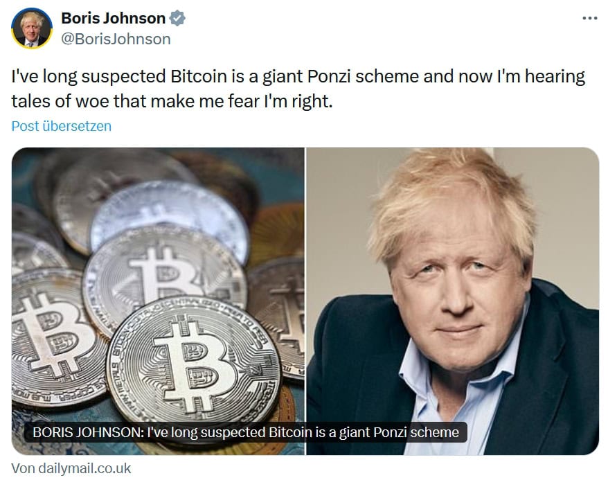 Aus der Bitcoin-Community gibt es deutliche Kritik an den Aussagen von Boris Johnson. So stellt etwa Strategy-Gründer Michael Saylor richtig: “Bitcoin ist kein Ponzi-Schema. Bei einem Ponzi-Schema verspricht ein zentraler Akteur Renditen und bezahlt frühe Investoren mit Geldern von späteren Investoren.” Die Kryptowährung hingegen sei lediglich ein offenes, dezentrales Geldnetzwerk, das “von Code und der Marktnachfrage” bestimmt werde. Nach dem jüngsten Kauf hält Strategy als weltweit größte Bitcoin-Treasury-Firma bereits 738.731 BTC im Wert von 52 Milliarden US-Dollar.