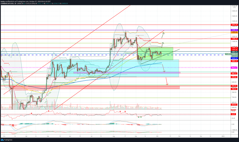 Covid-19 und seine Auswirkungen auf Gesellschaft, Politik und Finanzmarkt stehen auch diese Woche weiterhin im Fokus. Von diesen bleibt auch Bitcoin nicht verschont. In den letzten Handelstagen sorgte die Corona Erkrankung des US-Präsidenten Trump sowie das politische Hick-Hack zwischen Republikanern und Demokraten für Bewegung an den Finanzmärkten. Zwar hält sich die Unsicherheit der Anleger bisher noch in Grenzen, der deutlich Absturz des Goldkurses und die Flucht in den US-Dollar ließ auch Bitcoin um knapp 3 Prozentpunkte auf 10.550 US-Dollar korrigieren. Je länger der BTC-Kurs jedoch innerhalb seiner Range zwischen 10.150 US-Dollar und 11.099 US-Dollar handelt, desto wahrscheinlicher wird folglich eine bearishe Kursentwicklung.
