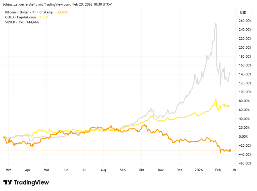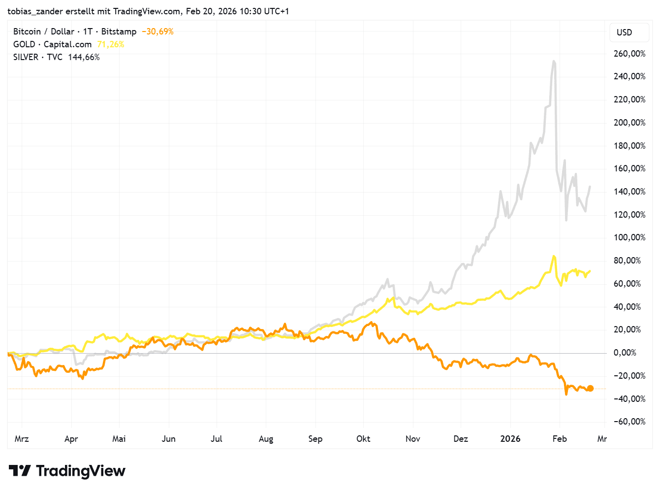 China scheide wegen fehlender Kapitalverkehrsfreiheit und mangelnder Transparenz als Alternative aus, Europa wiederum fehle es an Wachstumskraft und geopolitischer Geschlossenheit. Laut dem Krypto-Unternehmer droht daher eine Welt ohne klaren Währungsanker. In diesem Übergangsumfeld rotierte Kapital zuletzt zwischen Edelmetallen und Bitcoin – je nachdem, welchem Asset Investoren gerade den größten Schutz vor geldpolitischer Unsicherheit zutrauten.