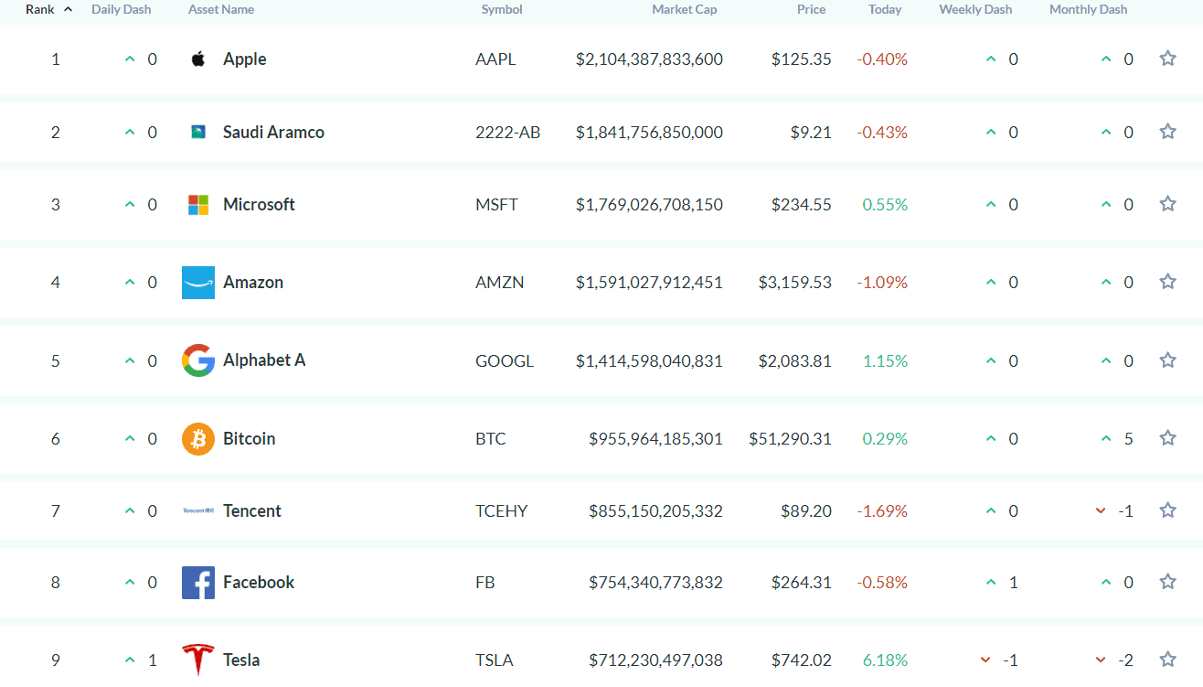 Der Höhenflug von Bitcoin hat die Kryptowährung in neue Wert-Sphären katapultiert. Begünstigt durch den Milliarden-Einstieg Teslas, kletterte der Kurs des digitalen Wertspeichers auf zwischenzeitliche 58.330,57 US-Dollar. Als Reaktion auf die Kursexplosion fiel der BTC-Kurs und konsolidiert sich aktuell bei ca. 51.500 US-Dollar (Stand: 25. Februar 2021). Trotz der derzeitigen Diskrepanz zum Allzeithoch von 11,51 Prozent, ist Bitcoin trotzdem das sechstwertvollste Asset der Welt nach Marktkapitalisierung. Damit überflügelt das digitale Asset seinen Förderer. Das zeigen Daten von AssetDash.