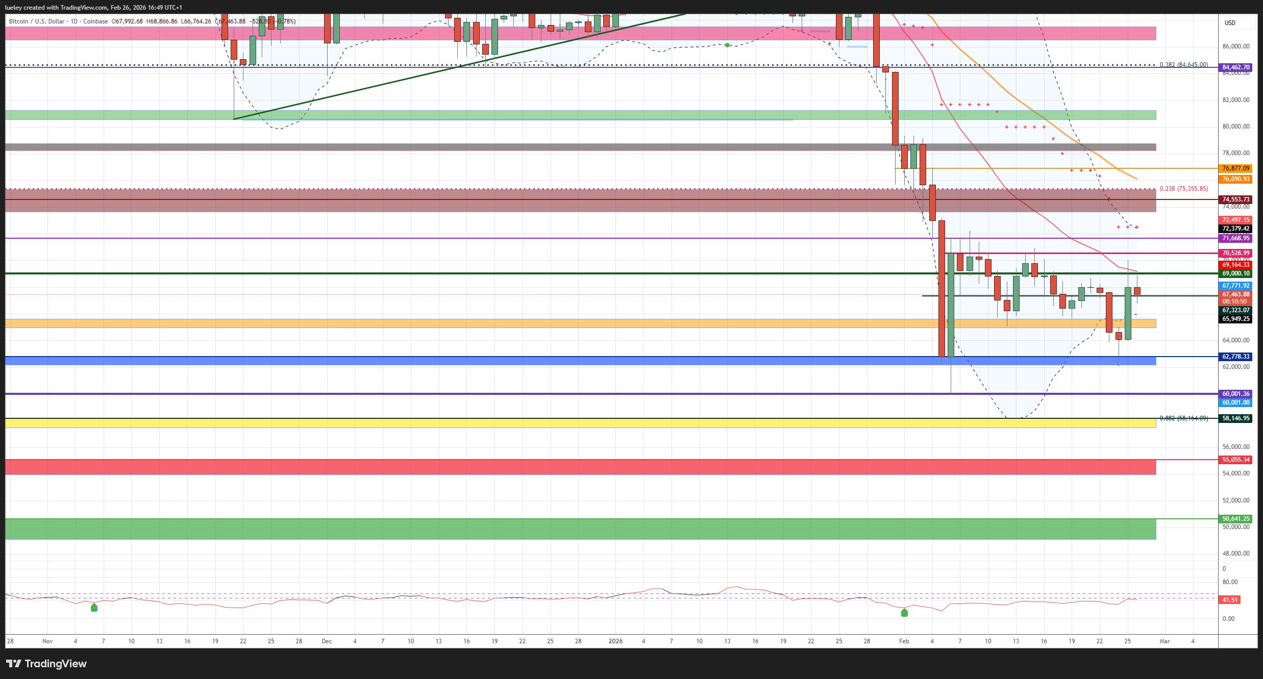 Ein dynamischer Rücksetzer bis an das markante Verlaufstief wäre in Anbetracht anhaltender Anlegerangst und fehlender Narrative eine Korrekturausweitung bis in den gelben Unterstützungsbereich um das 88er Fibonacci-Retracement zwischen 58.164 US-Dollar und 57.485 US-Dollar zunehmend wahrscheinlich. Diese Zone war zuletzt in 2024 ein relevantes Make-or-Break Niveau. Kann sich Bitcoin hier nicht nachhaltig stabilisieren und eine dynamische Gegenbewegung bleibt aus, muss mit einer bearishen Abverkaufsbewegung bis in den roten Supportbereich zwischen 55.117 US-Dollar und 53.959 US-Dollar gerechnet werden. Zuletzt fungiert dieses Kurslevel im Sommer 2024 als starke Unterstützung. Mit dem Realized Price bei 54.900 US-Dollar verläuft hier darüber hinaus eine relevante Onchain-Marke. Im ersten Versuch dürfte der Bitcoin-Kurs hier gen Norden abprallen.