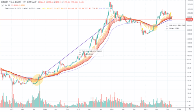 Wochenchart auf Basis des Wertepaares BTC/USD auf der Börse Bitstamp erstellt