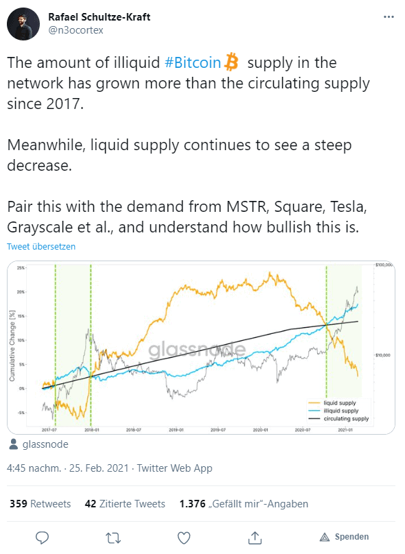 Obwohl sich der Bitcoin-Kurs damit noch immer in der Region seines Allzeithochs bewegt, ist das digitale Gold noch unterbewertet – zumindest, wenn man für die Kursprognose das Stock-to-Flow-Modell (S2F) heranzieht. Dabei wird die aktuelle Umlaufmenge (Stock) eines Rohstoffs durch die jährliche Fördermenge (Flow) geteilt. Als Ergebnis erhält man die Zahl der Jahre, die es bräuchte, um den bestehenden Stock bei gleichbleibendem Flow zu produzieren. Die Stock-to-Flow-Ratio gibt damit einen Hinweis auf die „Seltenheit“ eines Gutes. Sie findet häufig in der Bewertung von Rohstoffen wie Edelmetallen Anwendung. Der Krypto-Analyst Plan B hat das Stock-to-Flow-Modell auf Bitcoin angewendet und dabei eine Korrelation zwischen Bitcoin-Kurs, den Halvings und dem Stock-to-Flow-Verhältnis festgestellt, die ihn zu einem äußerst bullishen Langzeitausblick für den Bitcoin-Kurs bewogen hat.