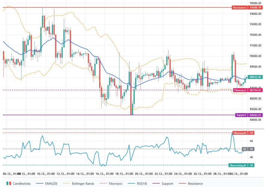 Innerhalb der letzten 24 Stunden bewegte sich der Kurs zwischen 86.845 US-Dollar (Tief) und 88.224 US-Dollar (Hoch) basierend auf den letzten vier 4h-Candles. Aktuell schloss BTC bei 88.030 US-Dollar und liegt damit leicht über dem Vortagesschluss von 87.691 US-Dollar. Die Marktkapitalisierung beträgt rund 1,76 Billionen US-Dollar.