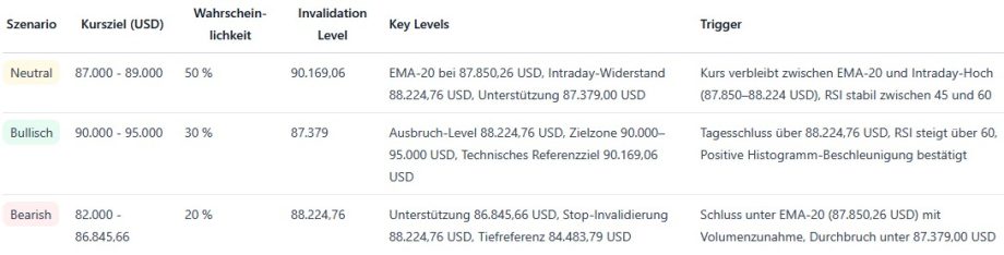 Kurzfristig bleibt die Prognose bullisch, jedoch innerhalb einer engen Range und mit steigendem Risiko bei Bruch unter Schlüsselunterstützungen. Unterstützungen: EMA-20 bei 87.850 US-Dollar, weitere Stufe 87.379 US-Dollar; Widerstände: 88.224 US-Dollar und 90.169 US-Dollar. Ein stabiler Ausbruch über 88.224 US-Dollar würde weiteres Aufwärtspotenzial in Richtung 90.000–95.000 US-Dollar eröffnen, während ein Durchbruch unter 87.379 US-Dollar die Abwärtsbewegung bis 86.845 US-Dollar bzw. 84.483 US-Dollar beschleunigen könnte. Wenn Du kurzfristig positioniert bist, empfiehlt sich ein diszipliniertes Risiko-Management mit engen Stops unter den genannten Unterstützungen.