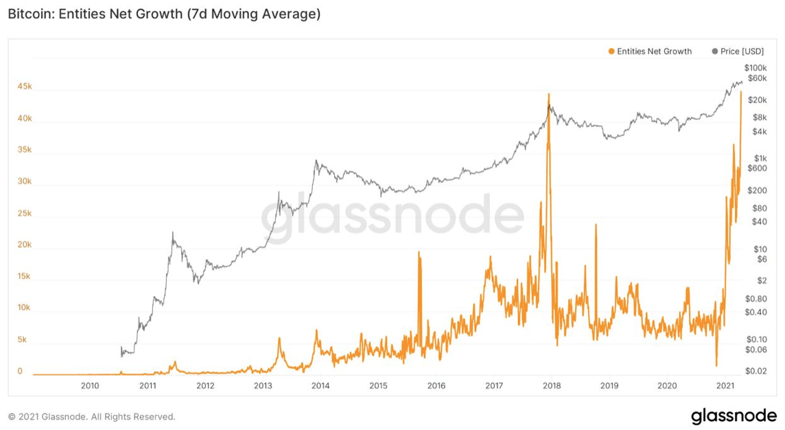 Dem übergeordnet gebe es zudem ein rasantes Netzwerkwachstum, dass ein bullishes Schlaglicht auf die Performance der kommenden Monate wirft. Über 50.000 neue Entitäten kommen im Schnitt täglich zur Blockchain hinzu. Ein gutes Zeichen: Der Bitcoin-Kurs steigt schließlich mit seiner Adoption.