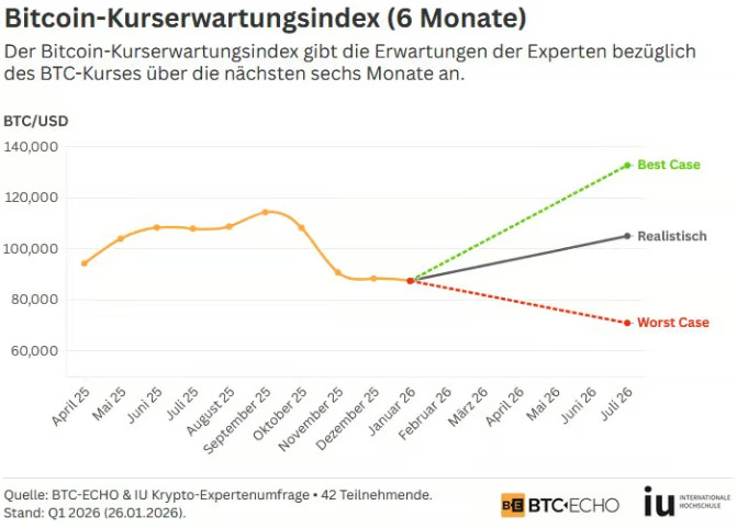 Der Indexstand liegt bei 25,8 Punkten und damit unter den 28,4 Punkten aus Q4 2025. Die historische Volatilität des BTC-Kurses vor der Umfrage über sechs Monate beträgt 28,9 (basierend auf täglichen log-Renditen im Zeitraum 19.01.2025 – 18.01.2026).