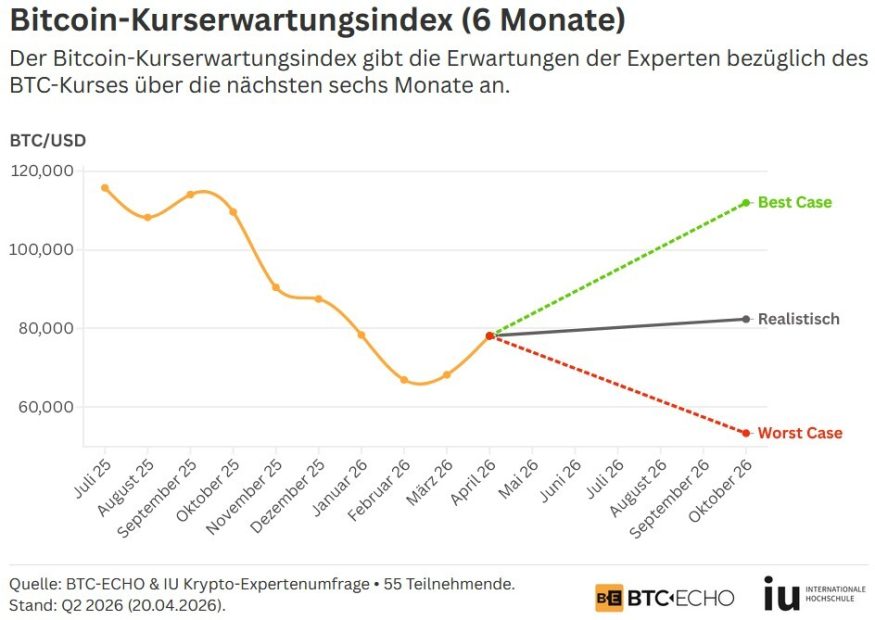 Der Indexstand liegt bei 29,6 Punkten und damit deutlich über den 25,8 Punkten aus Q1 2026. Die historische Volatilität des BTC-Kurses vor der Umfrage über sechs Monate beträgt 30,4 (basierend auf täglichen log-Renditen im Zeitraum 13.04.2025 – 19.04.2026).