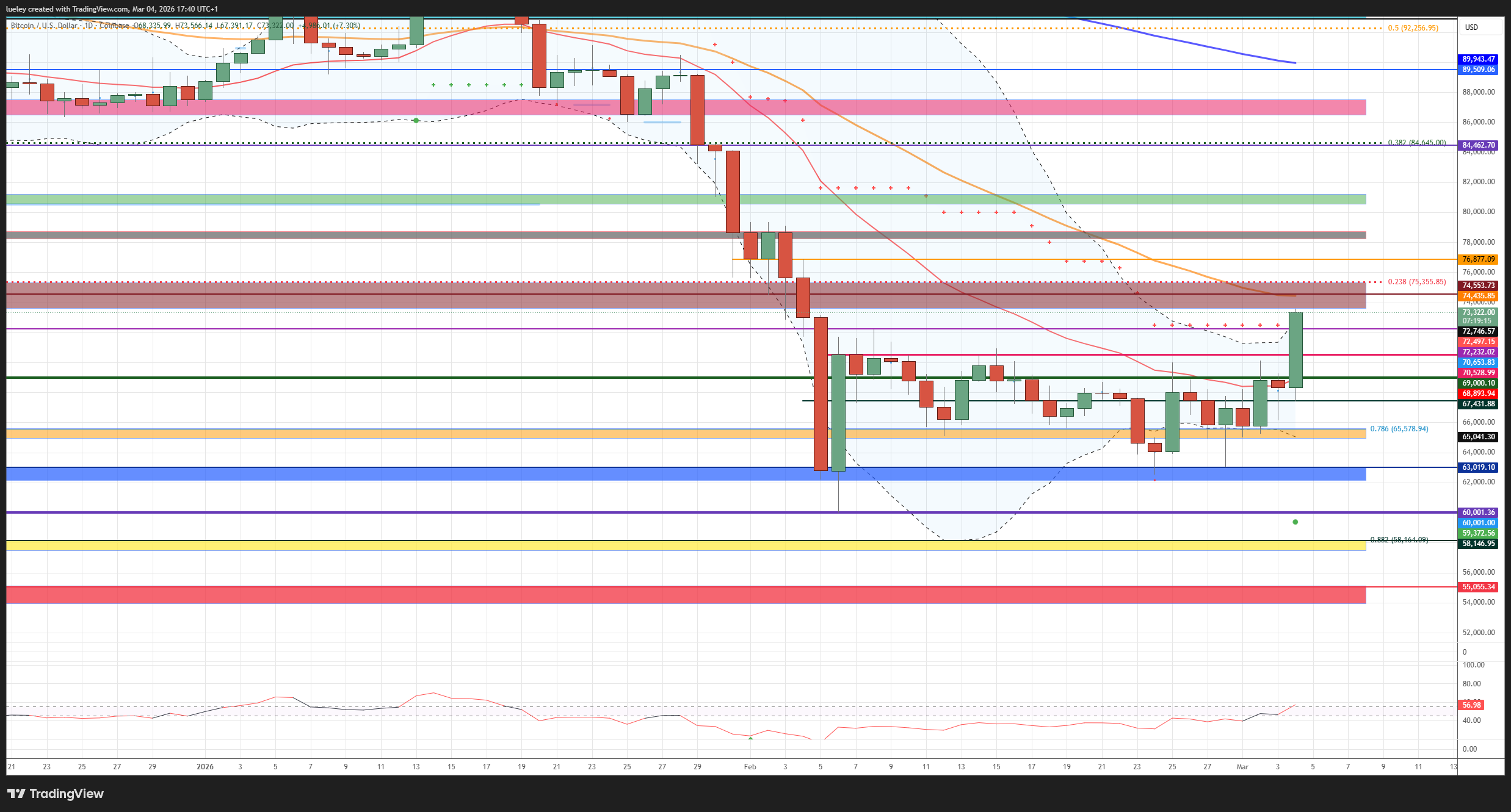 Bearishe Kursziele: 70.528 USD, 69.000 USD, 67.431 USD, 65.578/64.694 USD, 63.019/62.165 USD, 60.001 USD, 58.164/57.485 USD, 55.055/53.959 USD, 50.641/49.050 USD