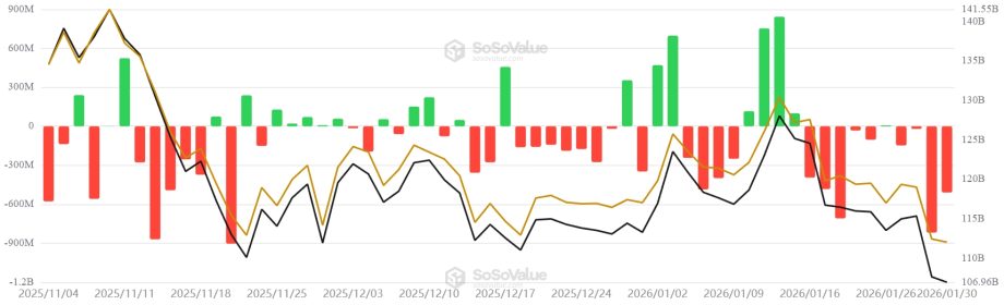 Unterstützt wird dieses Bild durch Nettokäufe von rund 152.000 BTC innerhalb von 30 Tagen sowie ebenfalls positive Sieben-Tage-Daten. Daher kommt der Report zu dem Schluss, dass “die aktuellen On-Chain- und Börsendaten darauf hindeuten, dass Bitcoin in eine Phase struktureller Konsolidierung eintritt, die von großen Holdern getragen wird und nicht von spekulativem Überschwang“. Ganz anders ist jedoch die Situation bei den traditionellen ETF-Investoren, welche lange als zuverlässige Bitcoin-Unterstützung galten.