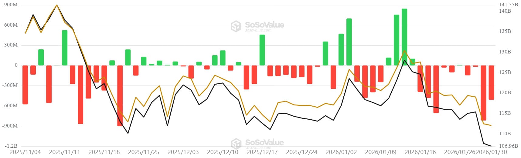 Im zurückliegenden Handelsmonat erlitten die Spot ETFs von BlackRock, Fidelity und Co. Nettoabflüsse in Höhe von 1,61 Milliarden US-Dollar, was dem zweitschlechtesten Ergebnis ihrer Geschichte entspricht. Nur im November zogen die ETF-Investoren mit 3,48 Milliarden US-Dollar eine noch höhere Summe ab. In Kombination mit dem gefallenen BTC-Kurs zeigt sich ein starker Rückgang beim Dollarwert des verwalteten Vermögens der Indexfonds: Von 164 Milliarden US-Dollar Anfang Oktober fiel dieser auf nur mehr 107 Milliarden US-Dollar.