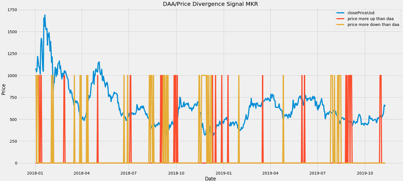 Implizit haben wir diese beiden Signaltypen schon. In obiger Abbildung ist einfach aufgetragen, wenn es eine starke Divergenz zwischen den Log-Returns gibt. Wir haben aber noch keinen Blick auf das Vorzeichen geworfen: Steigt der DAA-Trend an, während der Kurs sinkt oder umgekehrt?