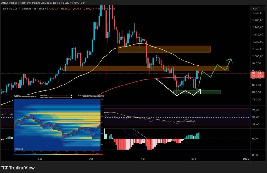Auf dem Tageschart zeigt BNB weiterhin eine konstruktive Marktstruktur. Der Kurs verteidigt die grüne Support-Zone und formt dort ein sauberes W-Pattern, das aktuell bei mehreren Altcoins erkennbar ist. Dieses Bild wird durch den MACD (Moving Average Convergence Divergence) unterstützt, der in den positiven Bereich dreht, sowie durch den RSI (Relative Strength Index), der seine Signallinie nach oben durchbricht. Beide Indikatoren gelten als klassische Frühhinweise auf zunehmende Käuferdynamik und eine potenzielle Fortsetzung der Aufwärtsbewegung.