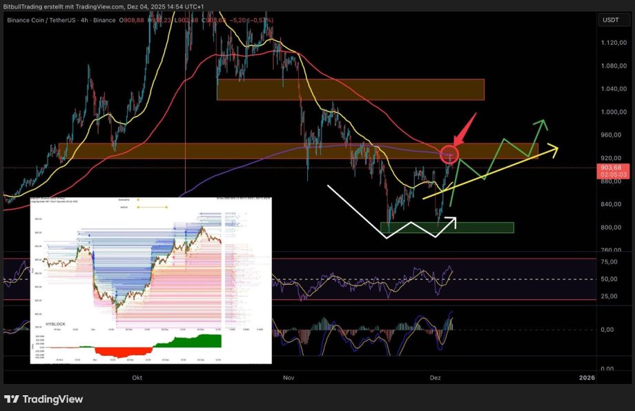 Im 4-Stunden-Chart wird deutlich, dass BNB aktuell am kombinierten Widerstandsbereich aus dem 200 EMA und dem 800 EMA ins Stocken gerät. Diese Zone gehört zu den relevantesten technischen Barrieren überhaupt, weshalb eine unmittelbare Durchbrechung historisch selten vorkommt. Die momentane Reaktion ist daher als normaler Marktverlauf zu interpretieren und kein Zeichen struktureller Schwäche.