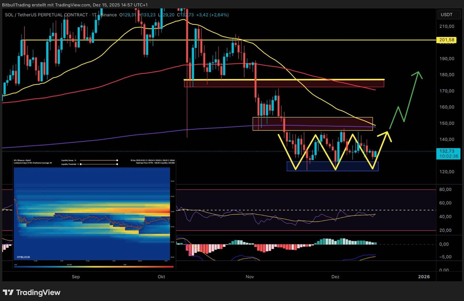 Der Solana Kurs präsentiert sich im Tageschart derzeit technisch sauber und gut strukturiert. Seit geraumer Zeit befindet sich der Markt in einer klar definierten Seitwärtsrange, was auf eine Phase der Orientierung und Marktfindung hindeutet. Auffällig ist dabei, dass sich oberhalb des aktuellen Kursniveaus zunehmend Liquidität aufbaut. Dieses Ungleichgewicht spricht strukturell eher für ein Aufwärtsszenario, da Märkte dazu neigen, nahegelegene Liquiditätszonen bevorzugt anzulaufen und abzuarbeiten. Entsprechend erhöht sich die Wahrscheinlichkeit, dass sich der Kurs mittelfristig eher nach oben als nach unten bewegt.