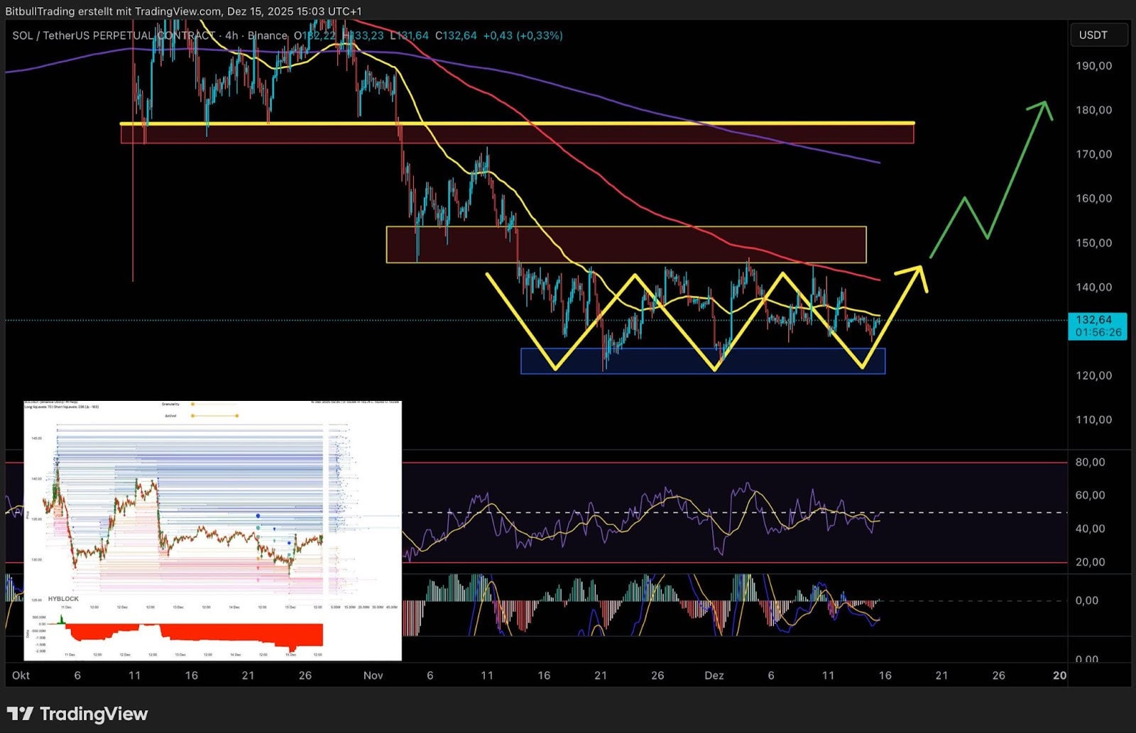Voraussetzung für dieses Szenario bleibt jedoch ein klarer Ausbruch über die gelb rote Widerstandszone. Erst wenn es Solana gelingt, diesen Bereich nachhaltig zu überwinden und sich oberhalb des EMA 800 sowie des EMA 50 im Tageschart zu etablieren, kann von einem validen Trendwechsel gesprochen werden. Entscheidend ist dabei nicht allein der kurzfristige Durchbruch, sondern vor allem die anschließende Bestätigung dieser gleitenden Durchschnitte als neues Support Niveau.