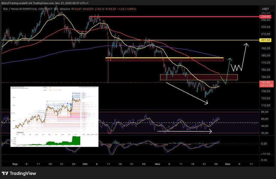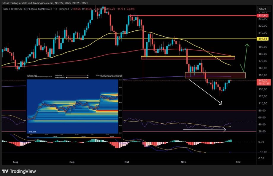 Unterstützend wirkt eine klar ausgeprägte bullish wirkende Divergenz in den Momentumindikatoren, die darauf hindeutet, dass der Verkaufsdruck nachlässt und Käufer allmählich wieder Kontrolle gewinnen. Gleichzeitig zeigt die Liquiditätsanalyse, dass oberhalb des Kurses bereits ein großer Teil an Short Liquidität abgearbeitet wurde, während sich darunter neue Liquiditätspools gebildet haben. Dieses Verhältnis birgt das Risiko, dass der Markt einen Rücksetzer vollzieht, falls es Solana nicht gelingt, zeitnah auszubrechen und weiteres Momentum aufzubauen. Die Struktur bleibt daher chancenreich, aber empfindlich gegenüber Verzögerungen im Kursverlauf.