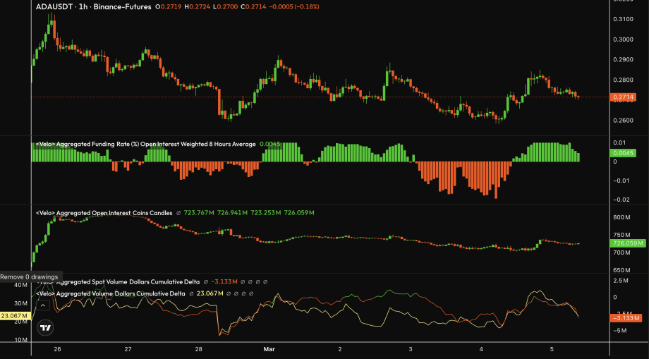 Ein Blick auf die Order-Flow-Daten zeigt, dass ein großer Teil der jüngsten Kursbewegung aus dem Derivatemarkt stammt. Das bedeutet, dass vor allem Trader mit gehebelten Positionen auf steigende Kurse gesetzt haben, während die tatsächliche Nachfrage im Spotmarkt, also der direkte Kauf von ADA, vergleichsweise schwach blieb.