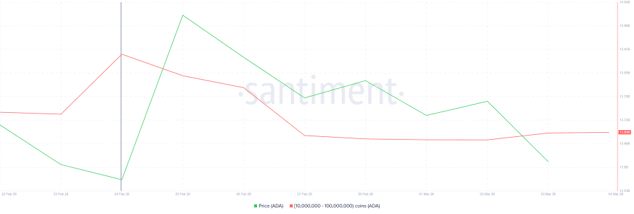 Parallel dazu zeigt sich auch bei großen Marktteilnehmern ein ähnliches Bild. Daten aus der Blockchainanalyse zeigen, dass sogenannte Wale, also Investoren mit besonders großen ADA-Beständen, zuletzt ebenfalls verstärkt Coins verkauft haben.