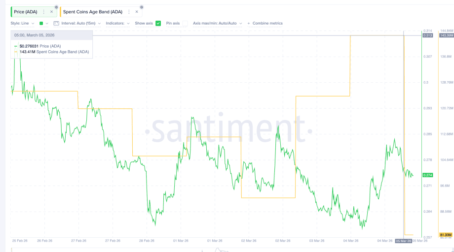 Auch On-Chain-Daten liefern Hinweise darauf, dass während der jüngsten Erholung verstärkt Coins bewegt wurden. Ein wichtiger Indikator hierfür ist das sogenannte Spent Coins Age Band. Diese Kennzahl zeigt, wie viele Coins aus älteren Beständen plötzlich wieder transferiert werden. Am 3. März wurden rund 93 Millionen ADA über die Blockchain bewegt. Nur zwei Tage später lag dieser Wert bereits bei über 143 Millionen ADA. Das entspricht einem Anstieg der Aktivität um rund 54 Prozent innerhalb kurzer Zeit.