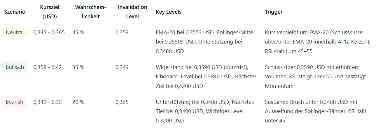 Der RSI liegt bei circa 52,0 und zeigt neutrales Momentum ohne Überkauftheit. Das Histogramm weist eine leicht positive Beschleunigung auf, was auf zunehmende Kaufdynamik hindeutet. Die Bollinger‑Band‑Breite beträgt rund 0,01550 USD (Oberband 0,36284 / Unterband 0,34734), was für niedrige bis moderate Schwankungen spricht. Der Markt befindet sich in einer engen Konsolidierungsphase; signifikante Bewegung ist erst bei Ausbruch über 0,3590 USD oder unter 0,3488 USD zu erwarten.