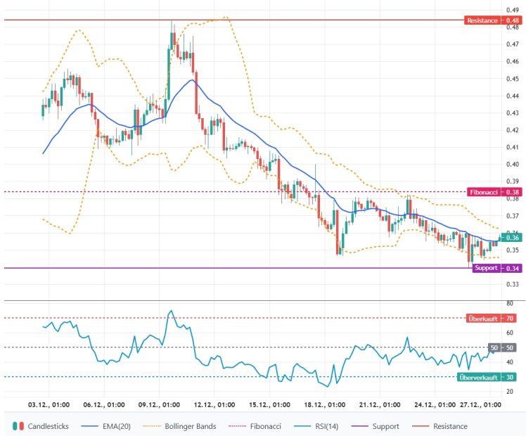 Kurzfristige Prognose für ADA am 27.12.2025: neutral bis leicht bullisch. Unterstützungen liegen bei 0,3488 USD und 0,3450 USD; Widerstände bei 0,3590 USD und 0,3840 USD (Fibonacci, Abwärtstrend). Ein bullishes Szenario wäre ein stabiler Schluss über 0,3590 USD mit Bestätigung durch steigenden RSI und Volumen. Ein bearishes Szenario aktiviert sich bei einem nachhaltigen Bruch unter 0,3488 USD mit Ausweitung der Bandbreite.