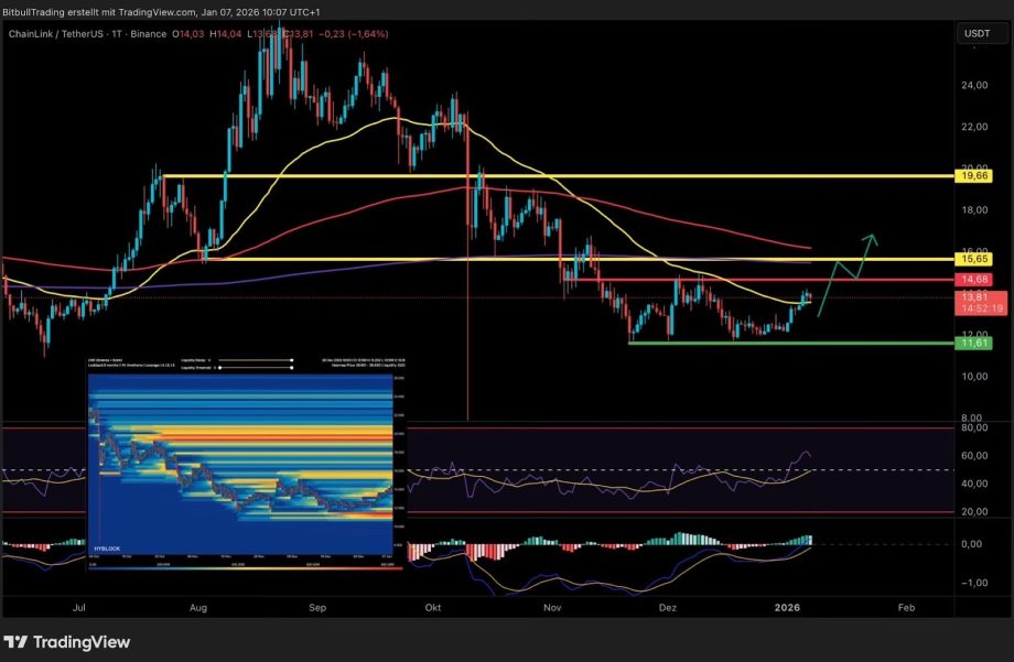 In diesem Zusammenhang spielt die weitere Entwicklung von Bitcoin eine zentrale Rolle. Sollte Bitcoin seine Aufwärtsbewegung fortsetzen und den Gesamtmarkt stabil nach oben führen, erhöht sich die Wahrscheinlichkeit deutlich, dass auch Chainlink ausreichend Momentum aufbaut, um den Widerstand an der roten Linie nach oben zu durchbrechen. Der nächste technisch relevante Bereich liegt anschließend in der ersten gelben Widerstandszone. Dieser Bereich ist besonders anspruchsvoll, da dort der EMA 800 verläuft und sich knapp darüber zusätzlich der EMA 200 befindet. Diese Konfluenz mehrerer gleitender Durchschnitte stellt eine markante Barriere dar, deren Überwindung spürbare Marktstärke erfordert.