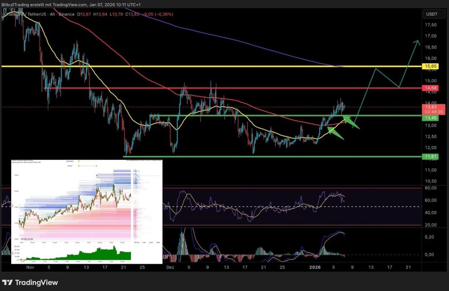 Auch im 4-Stunden-Chart präsentiert sich Chainlink weiterhin in einer sehr konstruktiven technischen Verfassung und profitiert von der aktuellen Stärke bei Bitcoin. Der Kurs konnte den Bereich des EMA 200 im 4-Stunden-Chart sauber als Support bestätigen. Zusätzlich wurde der Support an der grünen Linie erfolgreich angelaufen und verteidigt, was die Stabilität der aktuellen Marktstruktur unterstreicht.