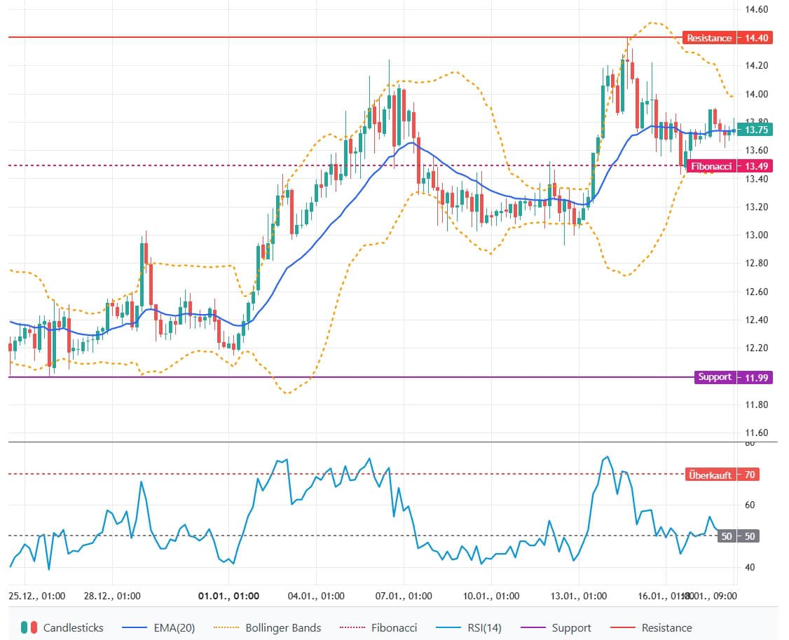 Der 14er‑RSI notiert bei 53,08, damit im neutralen Bereich. Das Histogramm zeigt nur eine marginale Beschleunigung des Aufwärtsmomentums, was auf begrenzte Kaufdynamik hindeutet. Die Bollinger‑Band‑Breite beträgt aktuell rund 0,45 USD, was auf moderate Schwankungen hinweist. Der Markt konsolidiert kurzfristig innerhalb des Aufwärtstrends; das Risiko bleibt mittel, solange die kurzfristige Fibonacci‑Unterstützung bei 13,49 USD hält.