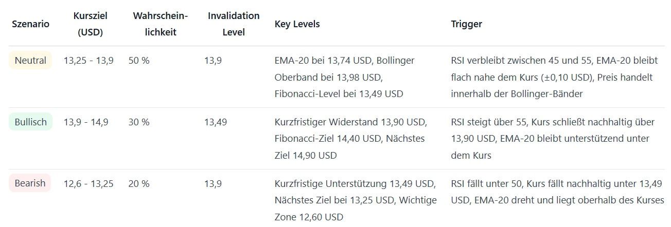 Die kurzfristige Prognose bleibt neutral bis leicht bullisch. Unterstützungen liegen bei 13,49 USD und 13,25 USD, Widerstände bei 13,90 USD und 14,40 USD. Ein Ausbruch über 13,90 USD könnte Beschleunigung Richtung 14,40–14,90 USD auslösen; bricht der Kurs nachhaltig unter 13,49 USD, drohen Abgaben bis 13,00–12,60 USD. Anleger sollten Breakouts mit Volumenbestätigung abwarten.