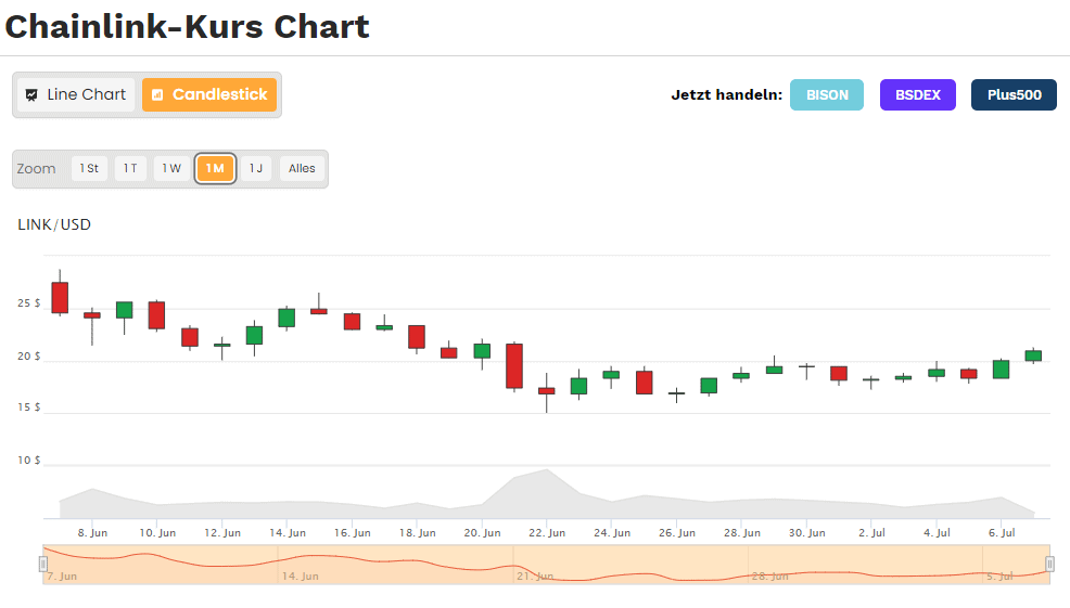 Auch Chainlink verzeichnete nach dem Krypto-Crash im Mai einen massiven Kursrückgang. Seit dem Allzeithoch bei 52,70 US-Dollar stürzte der Kurs von LINK um über 50 Prozent ab und handelte zeitweise sogar unter der Kursmarke von 17 US-Dollar.