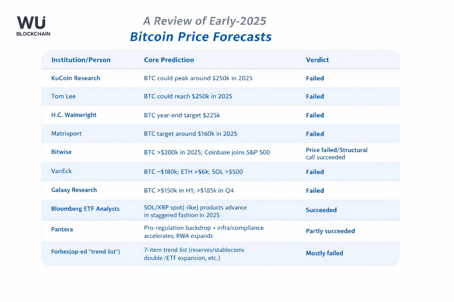 Dass Prognosen regelmäßig danebenliegen, ist an den traditionellen Finanzmärkten schon seit Langem bekannt. Wer die Seriosität der Kursziele beurteilen will, sollte deshalb weniger auf das aktuelle Kursziel als auf die Trefferquote früherer Prognosen achten. In der Praxis bestätigt sich nämlich häufig, dass falsche Vorhersagen schnell in Vergessenheit geraten, während einzelne Treffer im Nachhinein stärker hervorgehoben werden. Auch eine stehengebliebene Uhr zeigt zweimal am Tag die richtige Zeit an.
