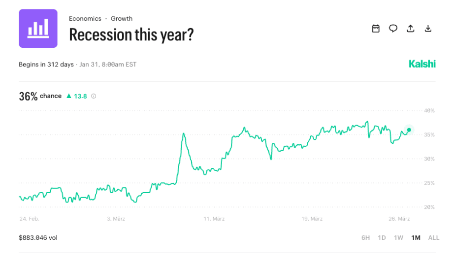 Steigende Energiepreise und straffere geldpolitische Erwartungen erhöhen außerdem bereits jetzt die Rezessionswahrscheinlichkeiten. Laut aktuellen Wettdaten von Kalshi liegt die Wahrscheinlichkeit einer US-Rezession für das Jahr 2026 bei 37 Prozent.