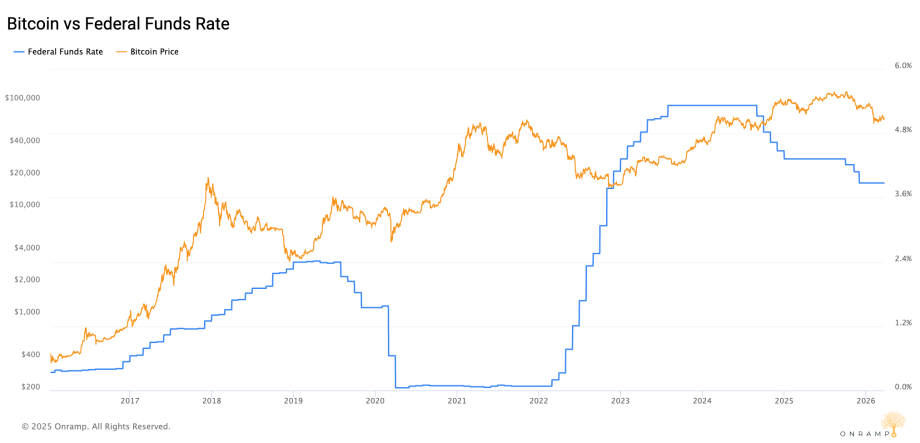 Historisch betrachtet korreliert Bitcoin negativ mit restriktiver Geldpolitik: Der Crash von 2022 (von rund 47.000 US-Dollar auf 16.000 US-Dollar) fiel exakt mit dem aggressivsten Zinserhöhungszyklus seit Jahrzehnten zusammen. Die Recovery 2023 begann, als die Fed das Ende restriktiver Geldpolititik in Aussicht stellte.