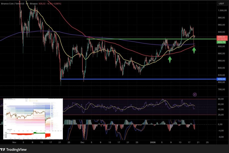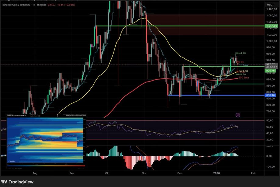 Die Liquidation Levels (unten links im nachfolgenden Chart) unterstreichen dieses neutrale Szenario. In der aktuellen Preisspanne besteht weiterhin ein Short Delta, während sich die Liquidität insgesamt relativ ausgewogen verteilt zeigt. Daraus ergibt sich ein Marktumfeld ohne unmittelbaren Zwang zu einer impulsiven Bewegung. Entscheidend bleibt nun, wie Bitcoin im weiteren Tagesverlauf reagiert und ob daraus neue richtungsweisende Impulse für den Gesamtmarkt und damit auch für BNB entstehen.