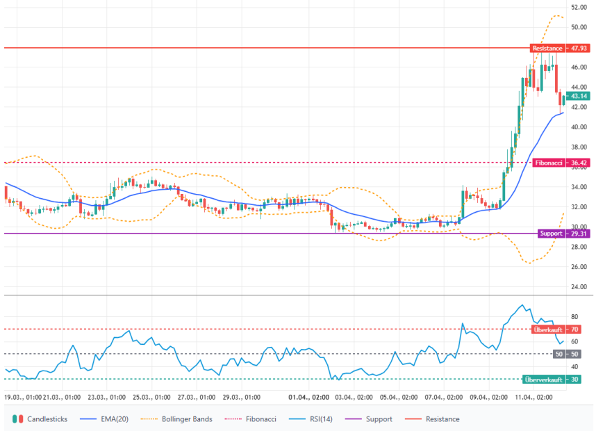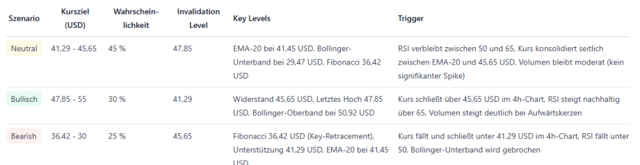 Auf der Unterseite bildet das jüngste Tief bei 41,29 US-Dollar die erste wichtige Unterstützung und liegt nahe am EMA-20. Wird dieser Bereich unterschritten, rückt die nächste markante Zone bei 36,42 US-Dollar in den Fokus, die sich aus einem Fibonacci-Retracement ableitet und als zentrale Unterstützung gilt.