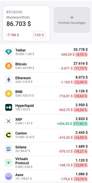 Redaktioneller Hinweis: Mit dem BTC-ECHO-Musterportfolio wollen wir euch eine Hilfestellung geben und bilden alle Kauflevels, Zielmarken und Transaktionen transparent ab – inklusive Historie, Performance-Tracking und strategischer Einordnung. Marktexperte Stefan Lübeck – seit über zehn Jahren als Trader und Chartanalyst tätig – ist der aktive Manager des Portfolios. Dieser Artikel stellt keine Anlageberatung dar und dient ausschließlich zu Informationszwecken.