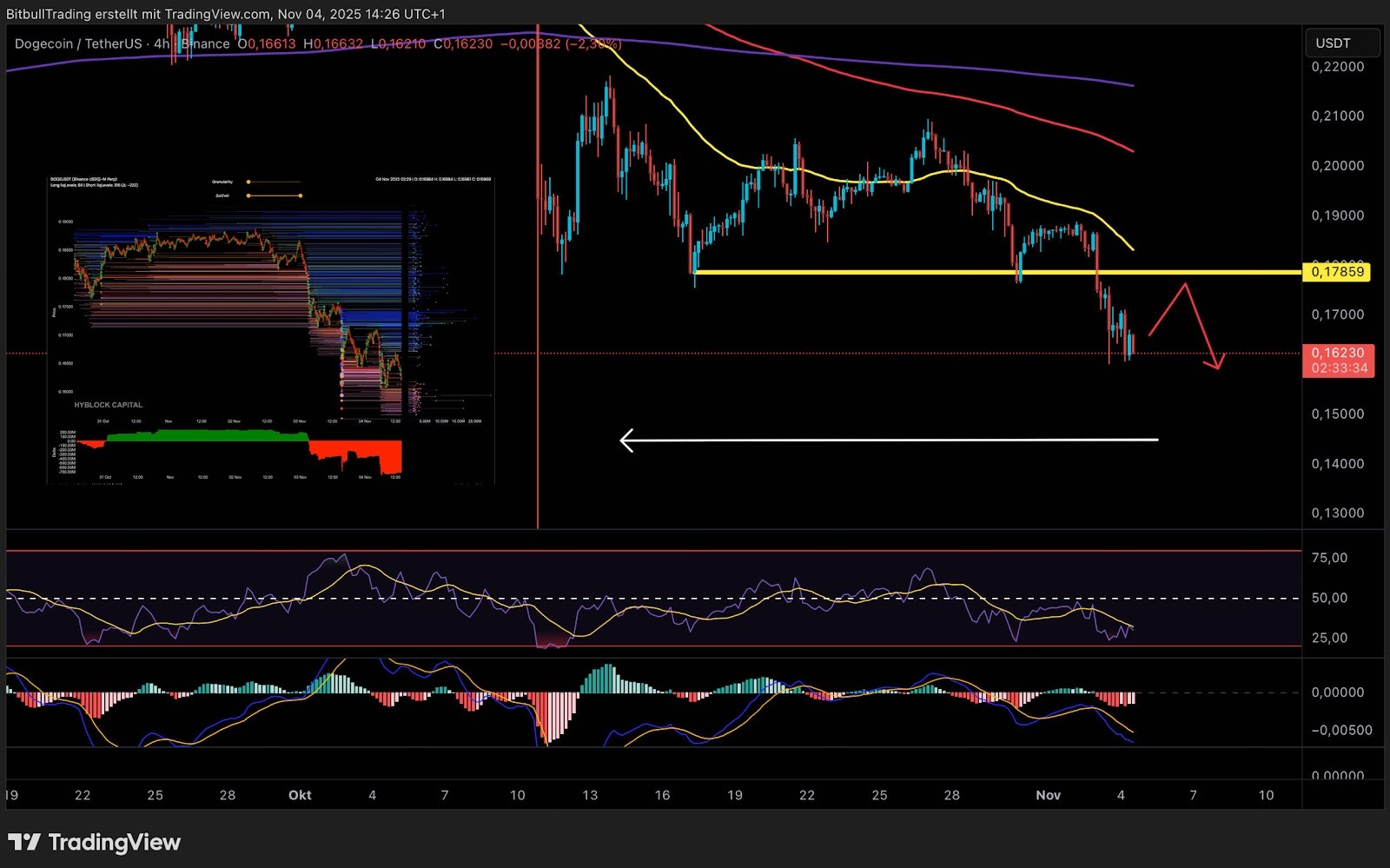 Auch im 4 Stunden Chart bestätigt sich das schwache technische Gesamtbild bei Dogecoin (DOGE/USDT). Eine nachhaltige Trendwende ist derzeit nicht erkennbar. Jeder Versuch, der 50 EMA nach oben zu durchbrechen, wurde von sofortigem Abgabedruck begleitet. Der Markt reagierte mit deutlichen Rücksetzern, wodurch der Kurs wieder in tiefere Preisbereiche gedrückt wurde.